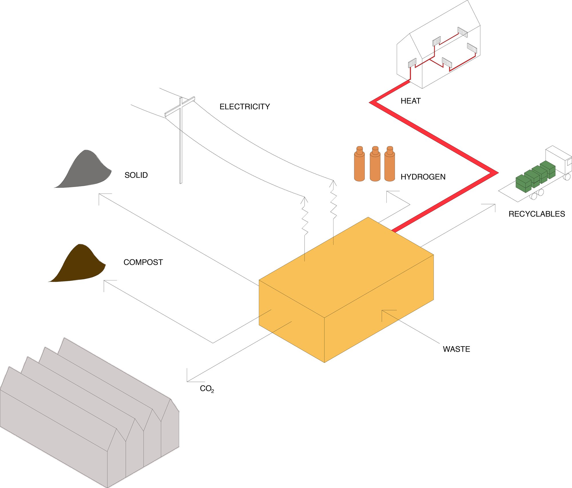 Working alongside other architects and designers, business planners, graphic designers and cost advisers to develop a coherent development masterplan for the Green Enterprise District, we developed a proposal for the delivery of sustainable waste management in East London. This project developed our research in 'Rubbish In, Resources Out', and proposes facilities using alternative waste treatment technologies to process waste and create electricity.