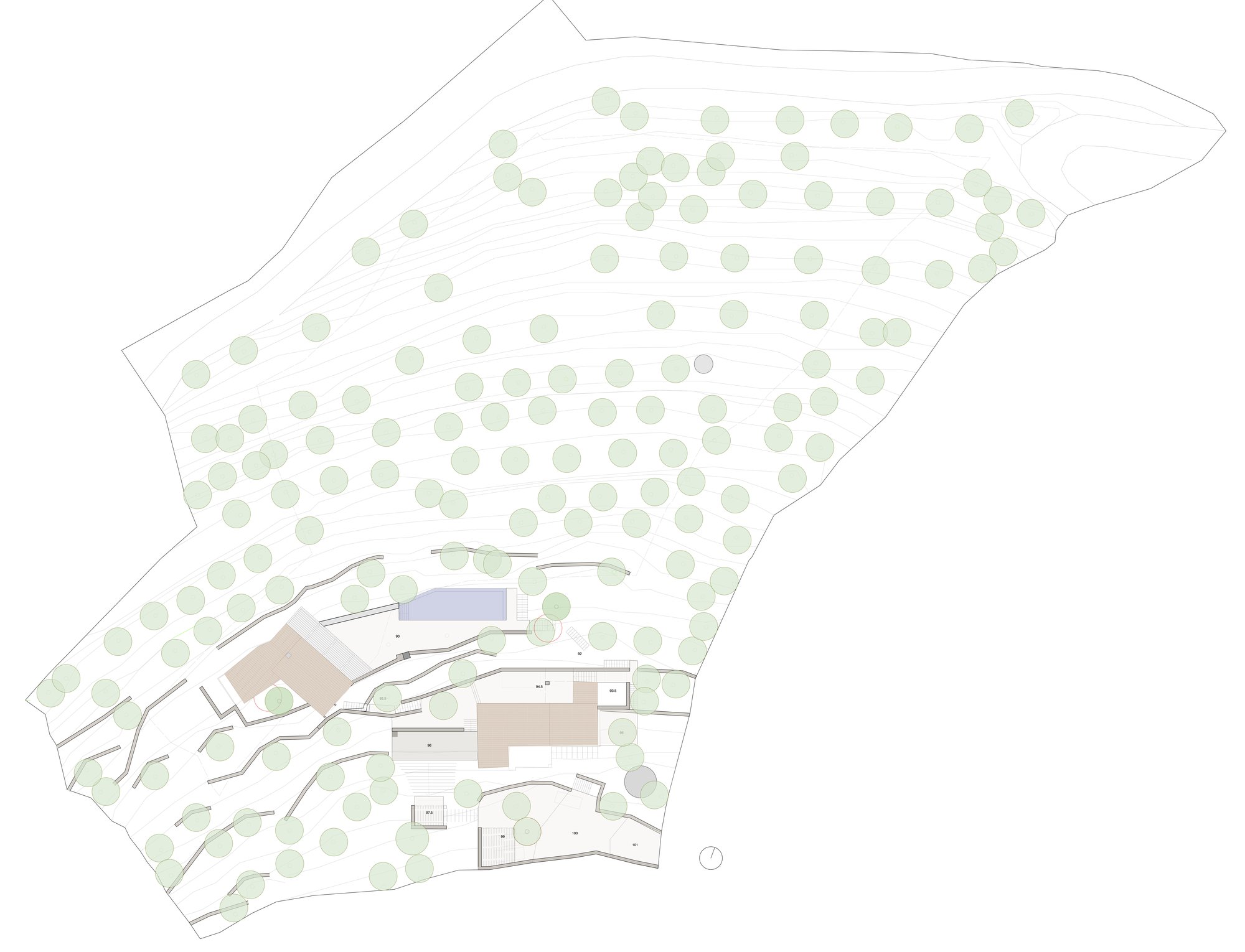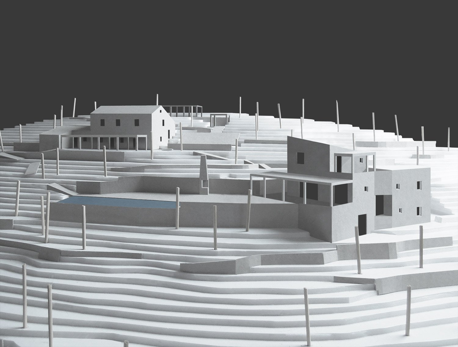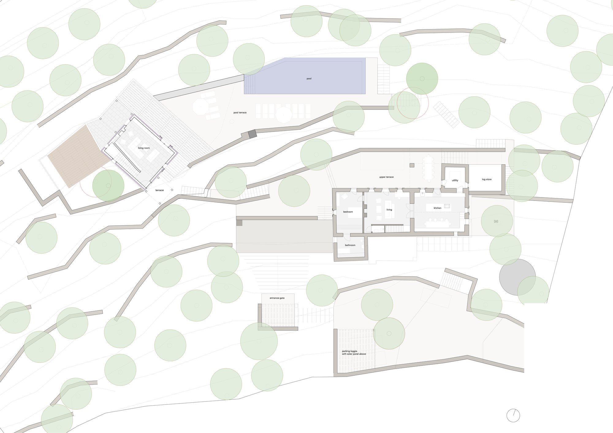 The new house sits below it, reached by a series of interconnecting spaces in the existing landscape. Terraces and steps overlook views and catch light at different times of day. The new house is made of stone excavated on the site and it extends this inhabited landscape indoors, with rooms oriented to open over different parts of the landscape, and opening out onto different levels.