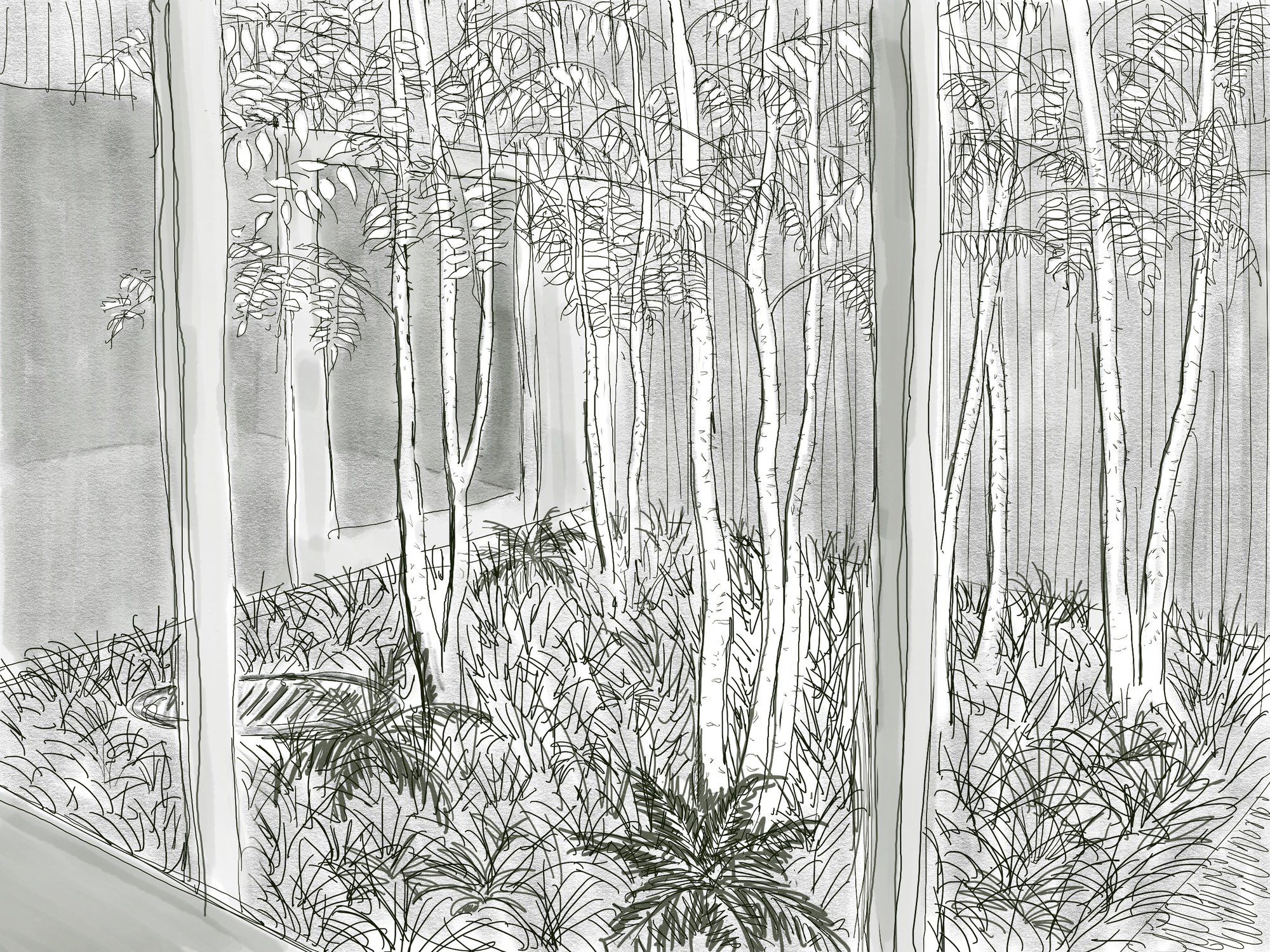 Our building is located on a triangular shaped site in the corner of the Velindre Cancer Care Centre car park. The site is unremarkable but backs onto an existing stand of trees. Our building takes you on a journey from the bleakness of the carpark, through an intimate courtyard garden, into a range of calm and contemplative spaces which focus on the stand of trees and a new landscape garden, designed by Cleve West.