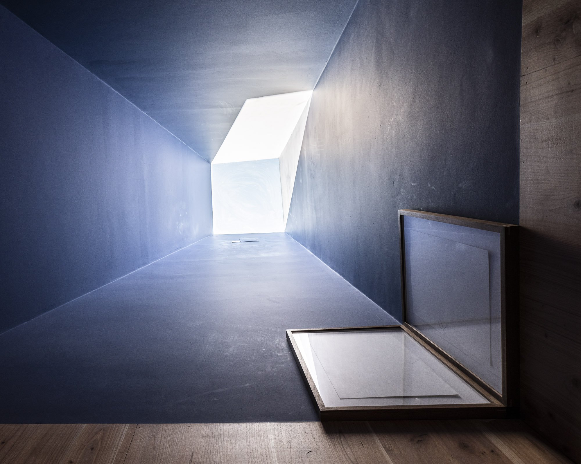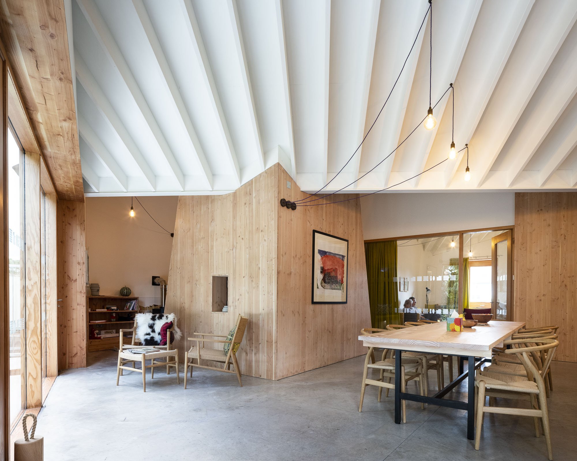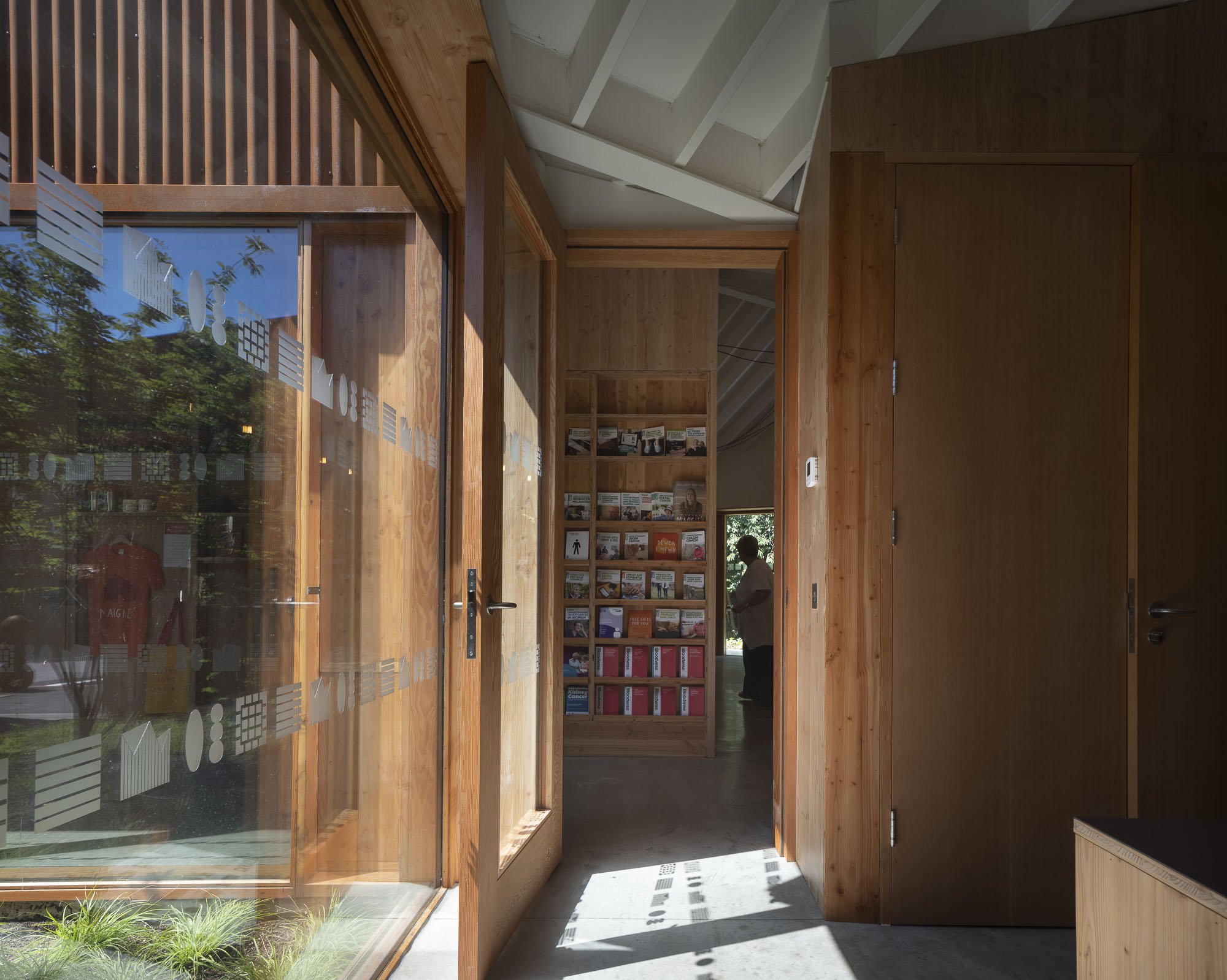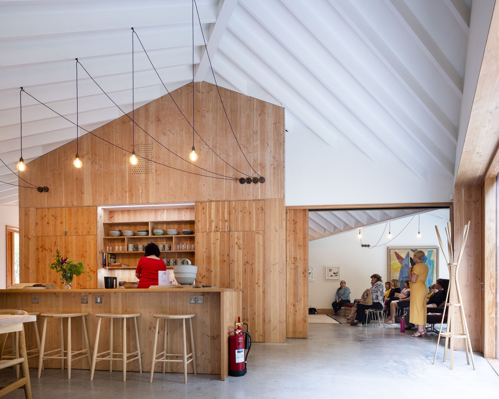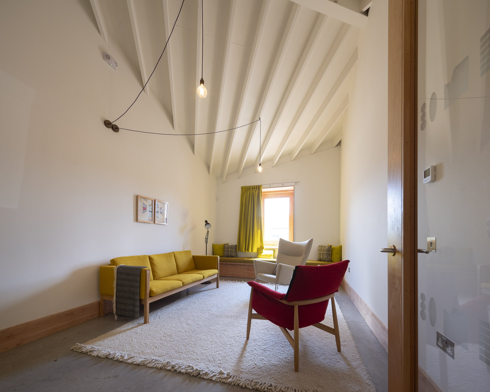 The interior spaces are formed between Douglas Fir lined walls which have a warmth and softness, and contrasts with the sleek polished concrete floor. At the heart of the building is the cwtch, a tall and intimate roof-lit space, inspired by the simnau fawr (big chimneys) of vernacular Welsh architecture.