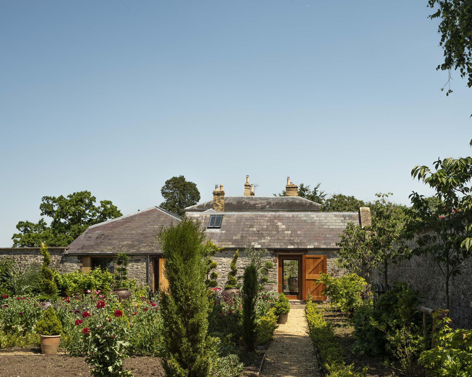 Our restoration extended to the walled kitchen garden. Through the conversion of the outbuildings, we were able to create more access to the garden from the main house. The project was therefore an exercise in master planning as well as a sensitive restoration project. The garden allows the owners to grow a substantial amount of their own food, and increases the biodiversity of the site.