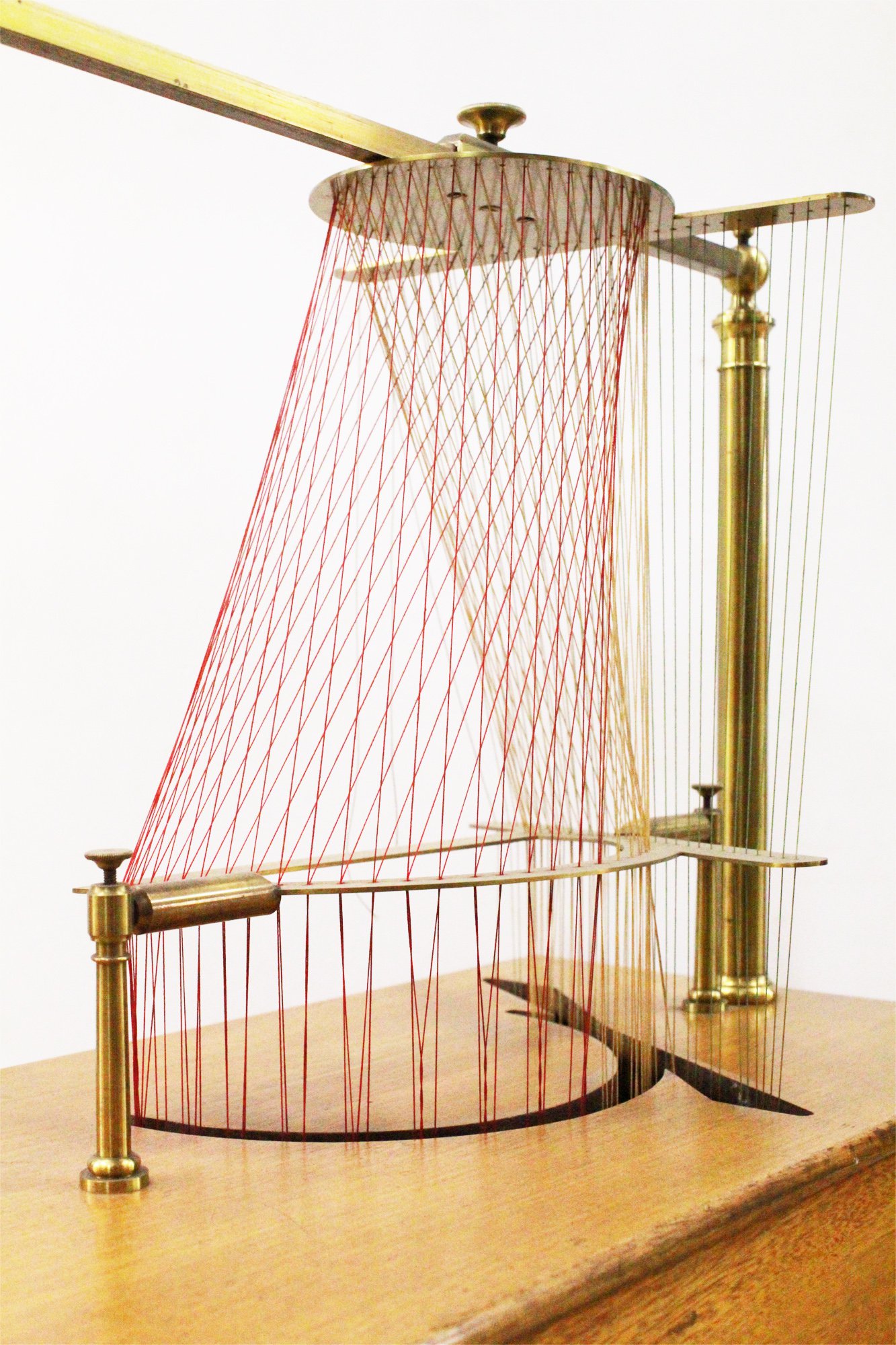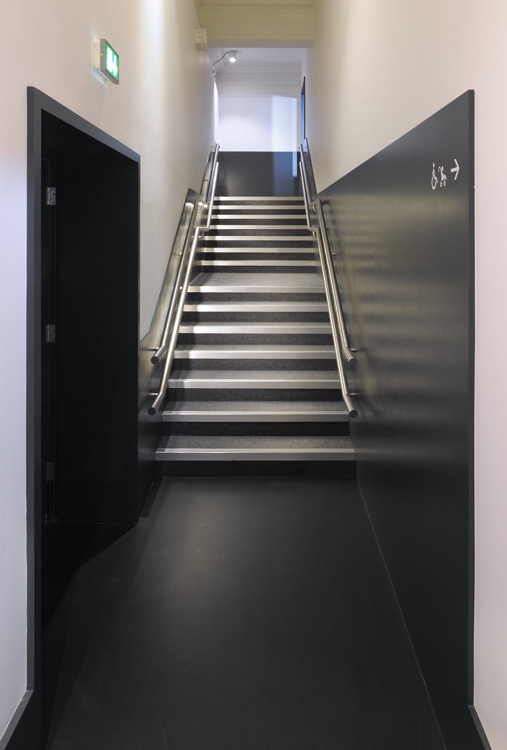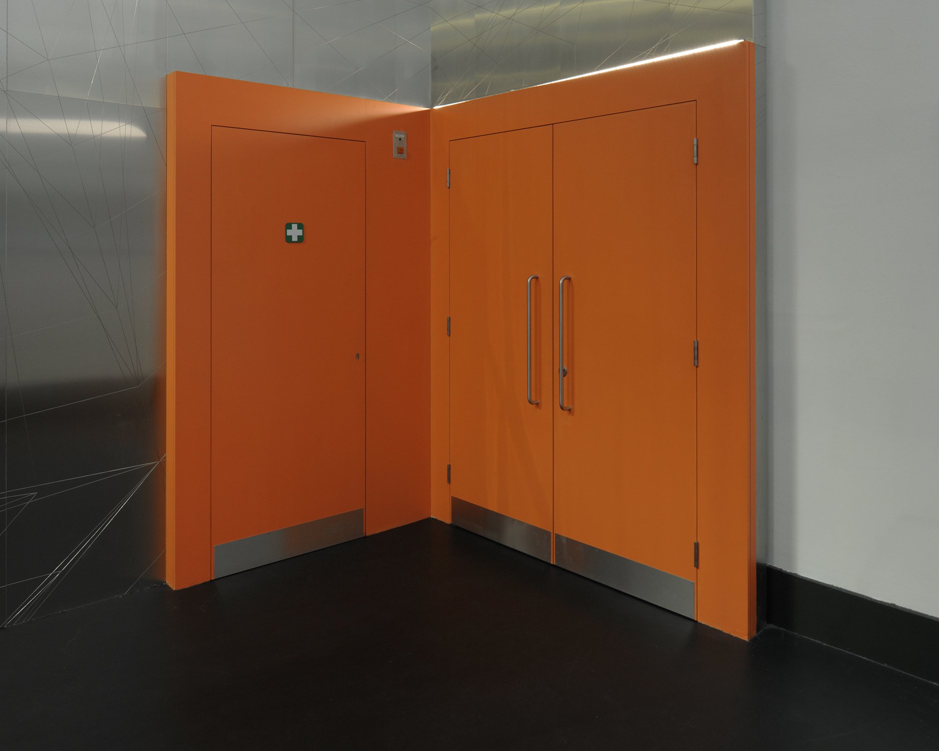 The entrance to the theatre is discreet and easy to miss, concealed by a staircase. We re- configures the entrance to the space, cladding the underside of the stair in engraved stainless steel to locate the theatre. The steel pattern is based on string models from the collection, which are Victorian models in the collection which teach the construction of complex geometrical forms.