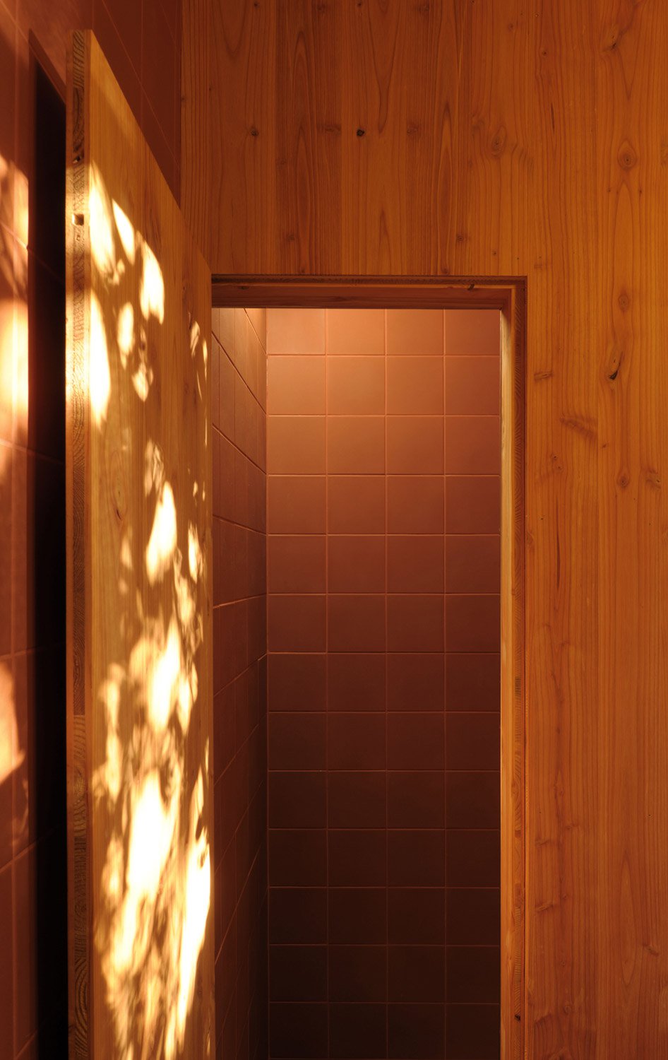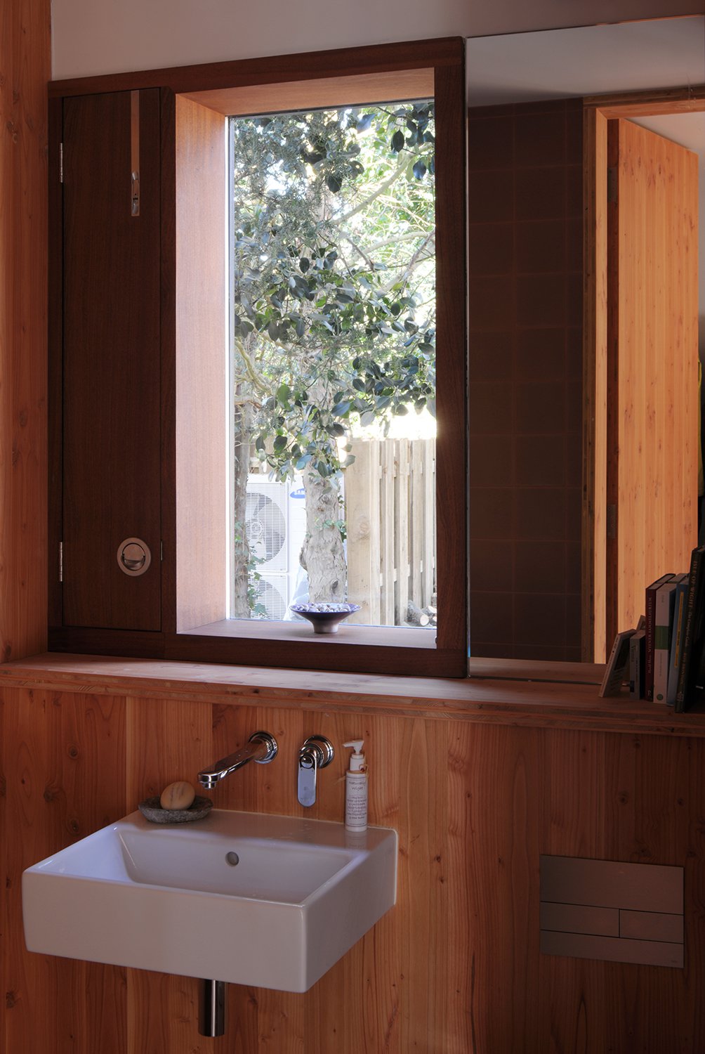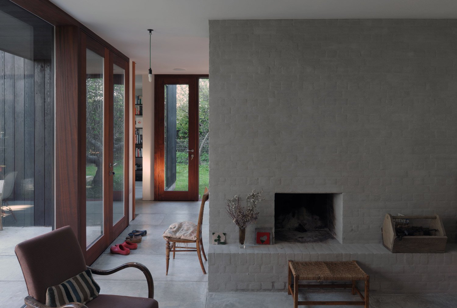 The timber-clad house, completed 2014, is designed as a series of layered spaces that extend into and around the fruit trees, creating deep thresholds between spaces both inside and out. These deep thresholds provide a spatial generosity within the quiet form of the house.