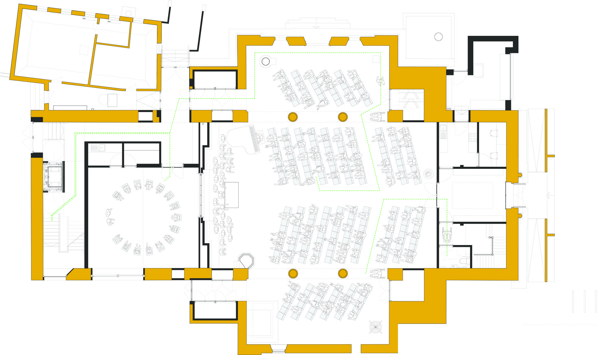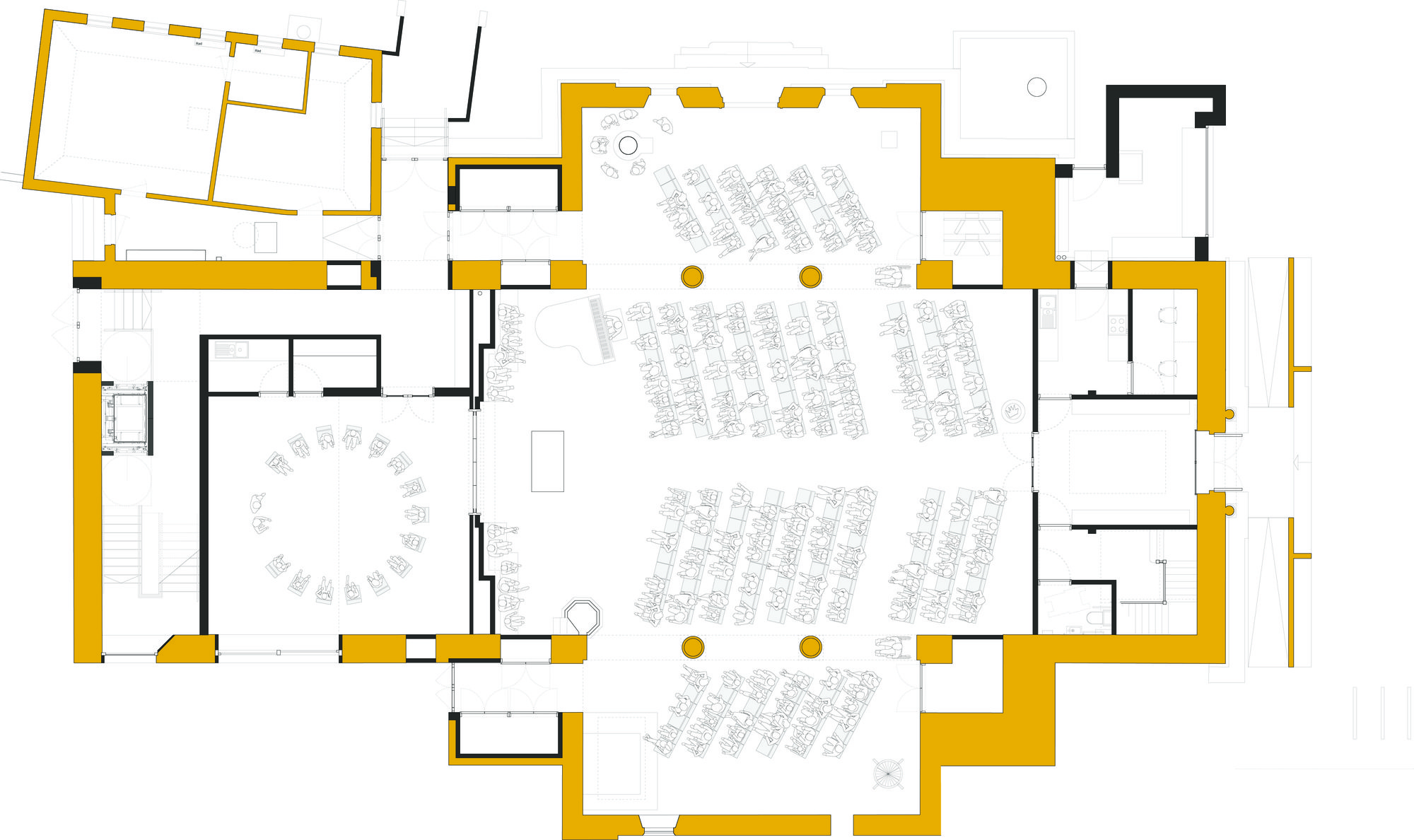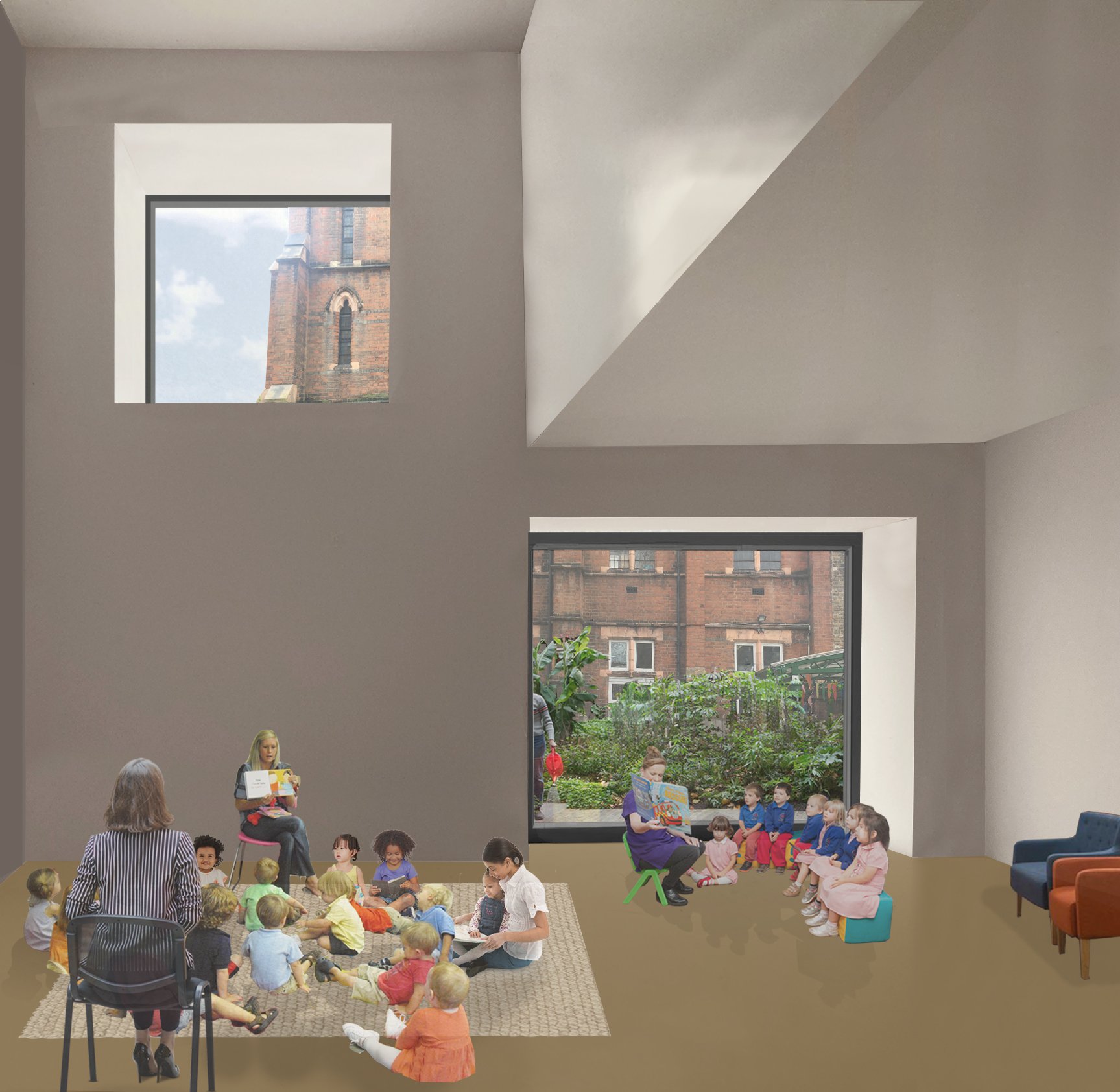 Beyond the reredos, the current dead space would be utilised to create a four-storey tower comprising a ground floor that would operate during services as the retro choir, used outside these times as a large semi-enclosed space with impressive windows overlooking a new garden. The first and second floors provide parish offices, toilets, a meeting spaces, and the top floor would be an impressive room open to the rafters, it could accommodate a variety of uses from Sunday School to Boys Brigade to ballet.