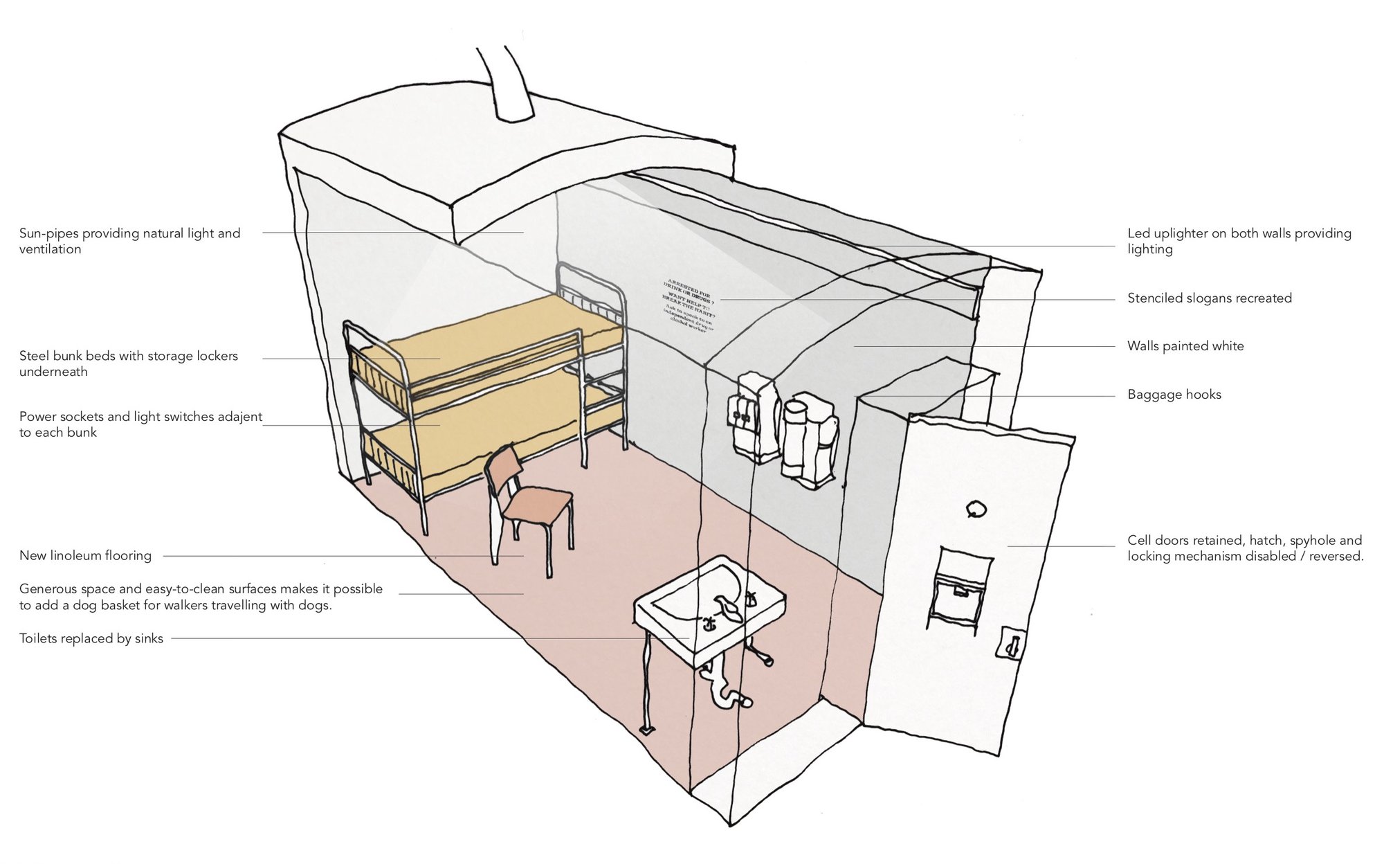 This project converts the former Police Station in to a hostel providing high quality affordable accommodation to visitors and tourists to Cardigan. We are working with 4CG, a local co-operative organisation, as a residential base for disseminating knowledge about community led development organisations. Like many market towns, Cardigan in West Wales has suffered from its town centre closing and public buildings and shops emptying. 4CG are reinvigorating Cardigan by bringing new public uses to these buildings, run as community-owned assets.